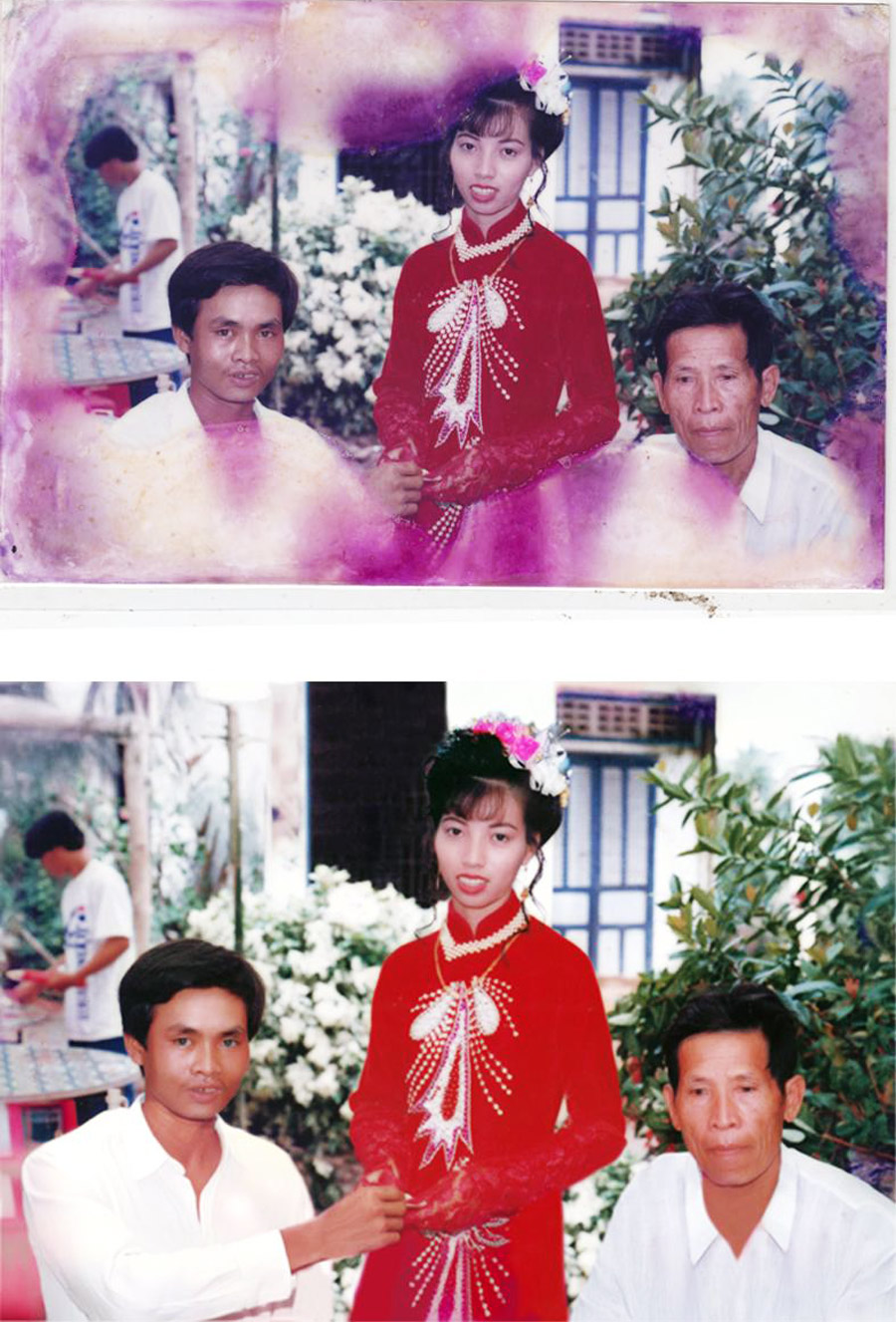 - Khôi phục lại chi tiết gương mặt, quần áo, phông nền bị hư hại.